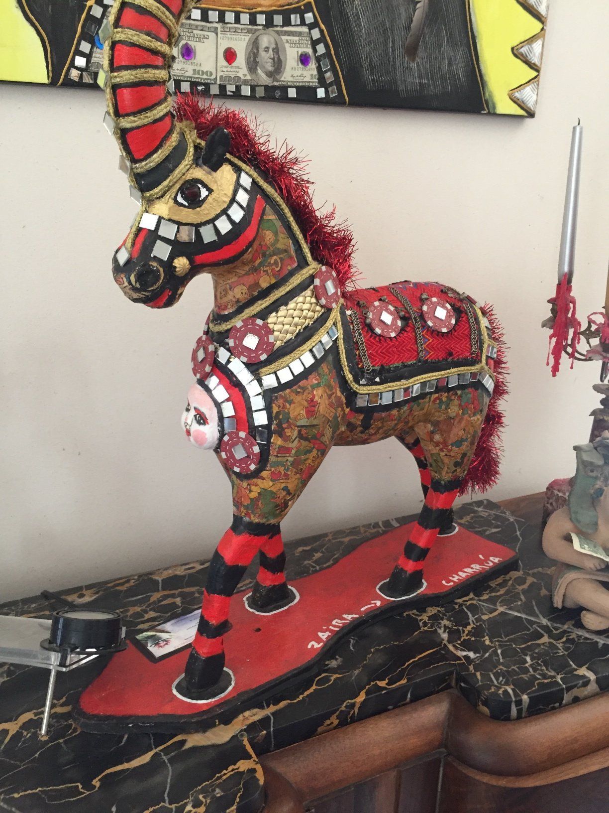 « Zaira est une artiste écologiste qui milite pour la reconnaissance des indiens Charrua en Uruguay. Elle utilise des matériaux récyclés et s'inspire dans les mythes et histoires de ses ancêtres pour délivrer un art original d'influence pré-colombienne, mexico-révolutionnaire et multi-coloré de la fôret d'Amazonie»